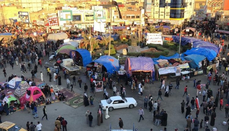 بدا معتصمو ساحة الحبوبي في ذي قار، السبت، ببناء خيم الاعتصام بواسطة “البلوك”.