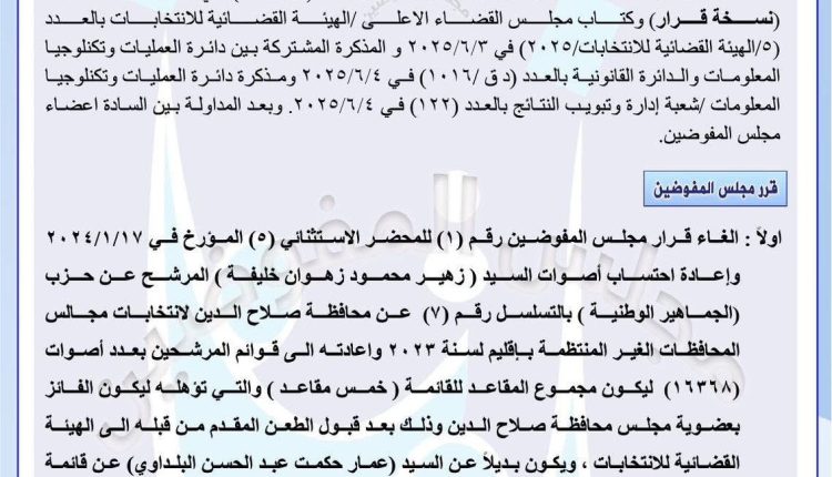 إعادة احتساب اصوات المرشح زهير الزهوان ليكون عضواً في مجلس محافظة صلاح الدين بدلاً من السيد عمار حكمت وبذلك تصبح لحزب الجماهير خمسة مقاعد والاطار مقعدين فقط .