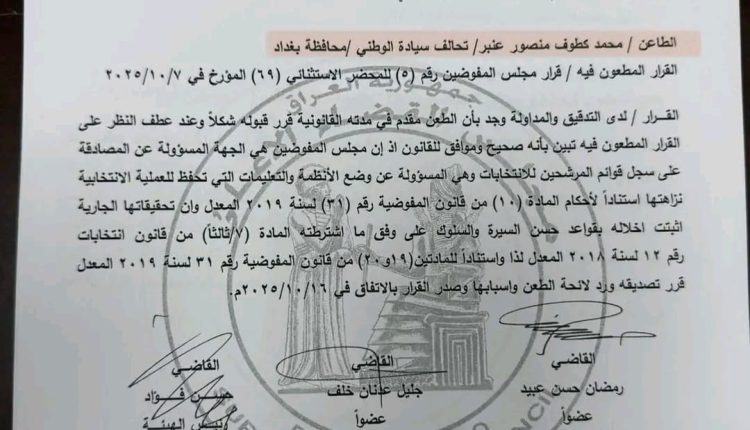 وبحسب الوثيقة الصادرة عن الهيئة القضائية للانتخابات التابعة لمجلس القضاء الأعلى، والمؤرخة في 16 تشرين الأول 2025، فقد قررت الهيئة تصديق قرار مجلس المفوضين رقم (69) الصادر بتاريخ 7 تشرين الأول الجاري، القاضي باستبعاد الدايني من الترشح.