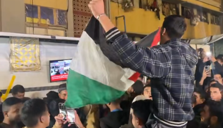 تجمّع العشرات من سكان قطاع غزة، الخميس، قرب مستشفى الأقصى احتفالاً بقرب التوصل إلى اتفاق لوقف إطلاق النار بين حركة حماس والجيش الإسرائيلي، بعد إعلان الرئيس الأميركي دونالد ترمب توقيع الجانبين على “المرحلة الأولى” من خطة سلام ترعاها واشنطن.