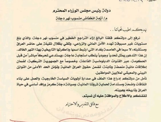 وجّه عضو مجلس النواب محمود حسين القيسي، اليوم الخميس، كتاباً رسمياً إلى رئيس الوزراء محمد شياع السوداني بشأن التراجع الخطير في مناسيب نهر دجلة، محذراً من أنه يمثل تهديداً مباشراً للأمن المائي والغذائي والبيئي في العراق.