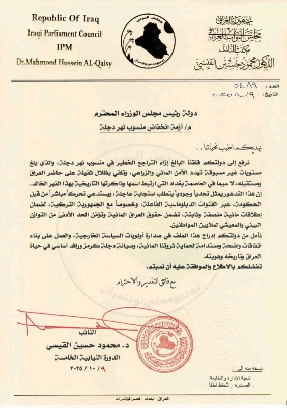 وجّه عضو مجلس النواب محمود حسين القيسي، اليوم الخميس، كتاباً رسمياً إلى رئيس الوزراء محمد شياع السوداني بشأن التراجع الخطير في مناسيب نهر دجلة، محذراً من أنه يمثل تهديداً مباشراً للأمن المائي والغذائي والبيئي في العراق.