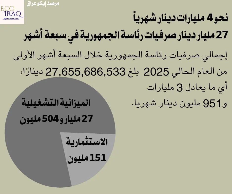 كشف مرصد “إيكو عراق” أن الصرفيات الفعلية لرئاسة الجمهورية خلال الأشهر السبعة الأولى من العام بلغت أكثر من 27.6 مليار دينار، بمتوسط يقارب 4 مليارات دينار شهريًا، ذهب 99% منها إلى النفقات التشغيلية كالرواتب والسفر والمستلزمات والحماية، مقابل نفقات استثمارية متدنية لم تتجاوز 151 مليون دينار.