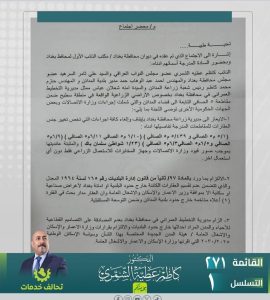 وأوضح أن أراضي سطيح هي أراضٍ زراعية محاطة بنهر دجلة من ثلاث جهات، وأن تحويلها إلى ملك صرف لوزارة الاتصالات أو لأي جهة أخرى “يُعد مخالفة صريحة لقرارات وزارة الزراعة وقرارات مجلس الوزراء ذات العلاقة”.