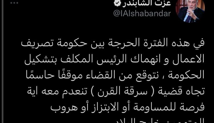وقال الشابندر، عبر “تويتر”: “في هذه الفترة الحرجة بين حكومة تصريف الاعمال و انهماك الرئيس المكلف بتشكيل الحكومة، نتوقع من القضاء موقفًا حاسمًا تجاه قضية ( سرقة القرن ) تنعدم معه اية فرصة للمساومة أو الابتزاز أو هروب المتهمين خارج البلاد”.