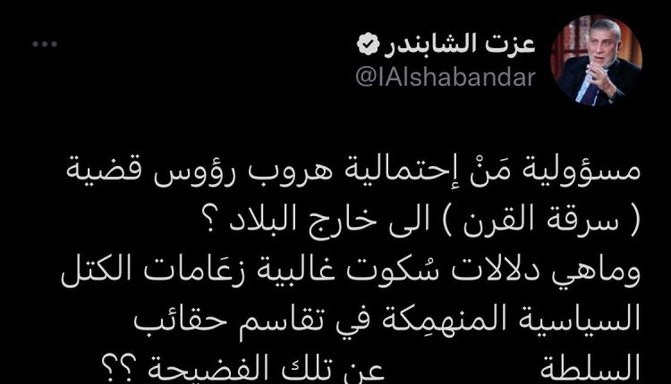 وقال الشابندر، عبر “تويتر”: “مسؤولية مَنْ إحتمالية هروب رؤوس قضية  ( سرقة القرن ) الى خارج البلاد؟”.