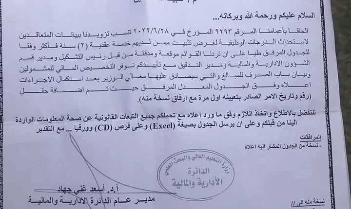 وبحسب وثيقة حصل عليها (موقعنا)، الثلاثاء، فان الوزارة طالبت الجامعات بتزويدها ببيانات موظفي العقود، للمباشرة بإجراءات التثبيت على الملاك الدائم.