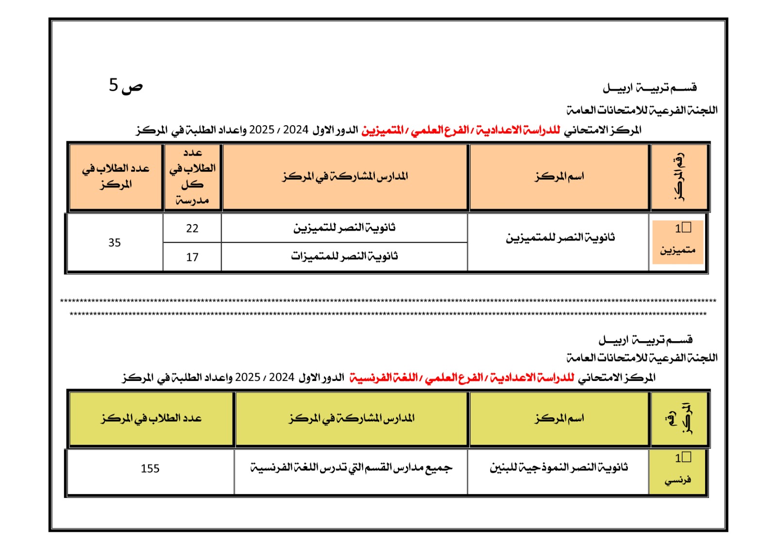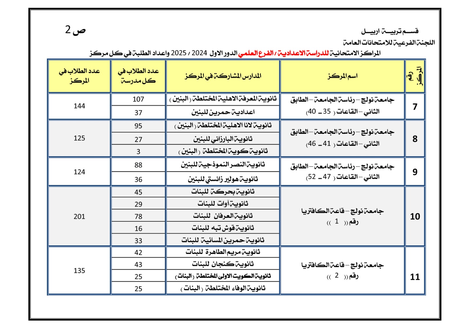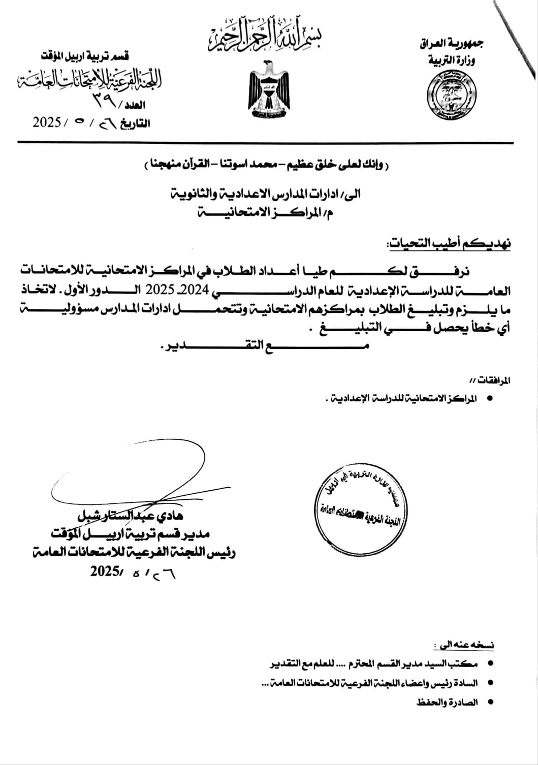 التربية تعلن مراكز امتحانات السادس الإعدادي في أربيل للعام الدراسي 2024–2025