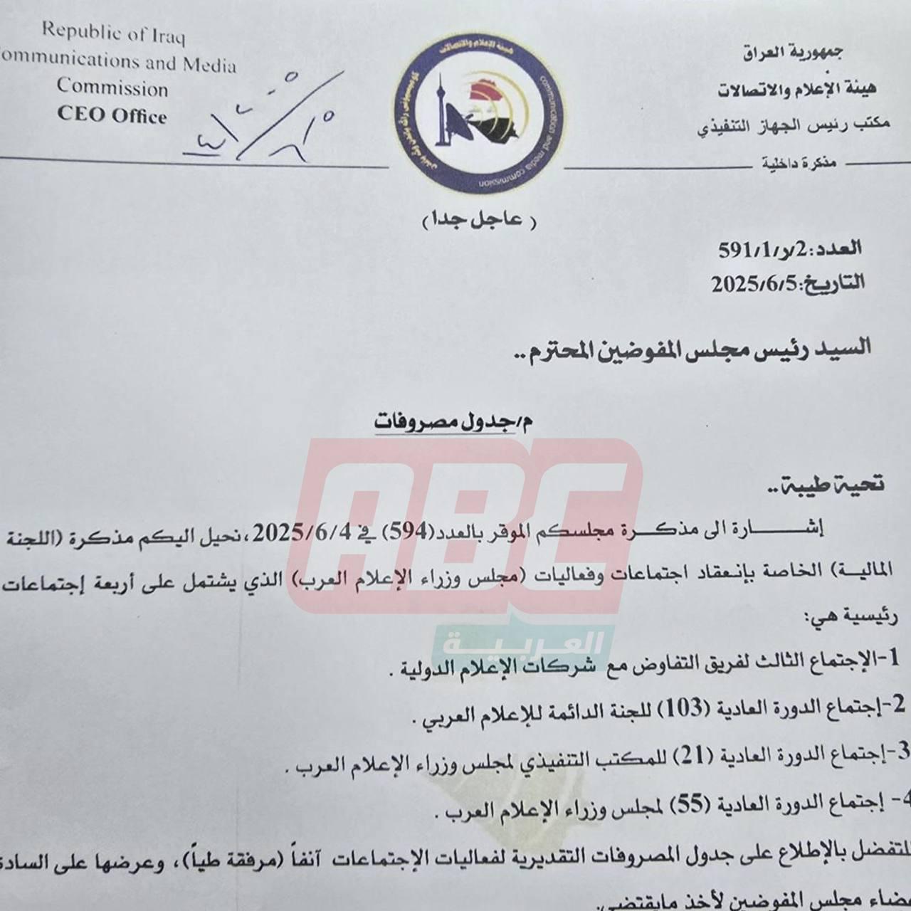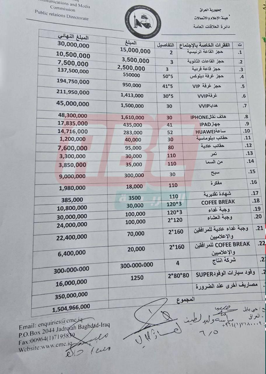 أظهرت وثائق رسمية أن هيئة الإعلام والاتصالات كانت قد استحصلت موافقة مسبقة على صرف أكثر من مليار ونصف المليار دينار عراقي لتنظيم مؤتمر وزراء الإعلام العرب في بغداد، الذي كان مقرراً ليوم واحد فقط، قبل أن يتم تأجيله بسبب تصاعد التوترات الإقليمية والحرب بين إيران و”إسرائيل”.