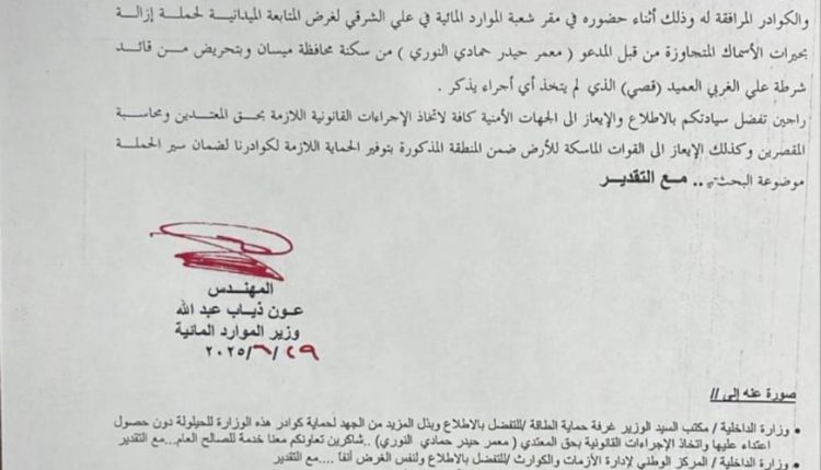 وثيقة: وزير الموارد المائية يبلغ رئيس الوزراء بتعرض وكيله لاعتداء في ميسان
