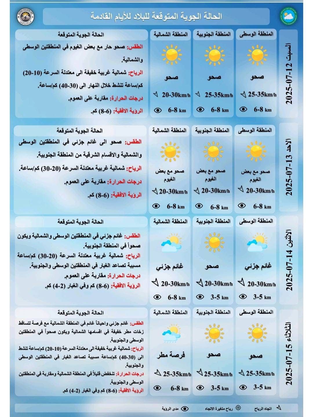 وقالت الهيئة في بيان ان “طقس يوم غد السبت سيكون صحوا حارا مع بعض الغيوم في المنطقتين الوسطى والشمالية ودرجات الحرارة مقاربة لليوم السابق على العموم”.