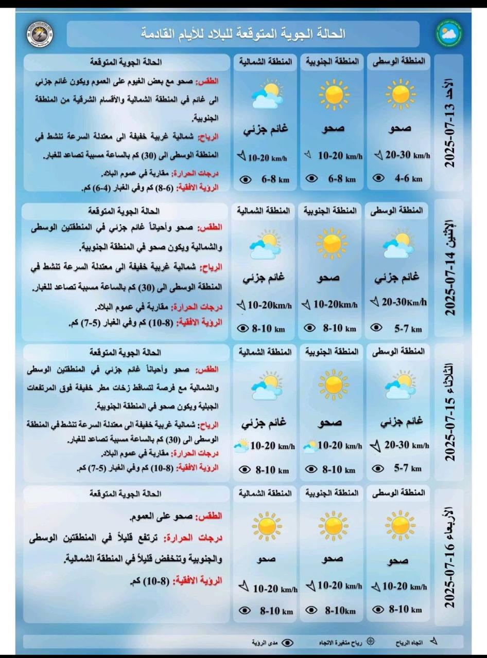 وأضافت أن “طقس بعد غد الإثنين سيكون صحواً وأحياناً غائم جزئياً في المنطقتين الوسطى والشمالية ويكون الطقس صحواً في المنطقة الجنوبية، والرياح شمالية غربية خفيفة إلى معتدلة السرعة تنشط في المنطقة الوسطى إلى (30)كم/س مسببة تصاعد الغبار، ودرجات الحرارة مقاربة لليوم السابق، الرؤية الأفقية (8-10)كم وفي الغبار (5-7)كم”.