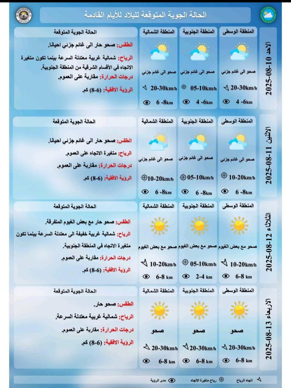 وأضافت ان “طقس يوم الثلاثاء سيكون صحوا حارا مع بعض الغيوم المتفرقة ودرجات الحرارة مقاربة لليوم السابق”، لافتة الى ان “طقس يوم الأربعاء سيكون صحوا حارا ودرجات الحرارة مقاربة لليوم السابق”.