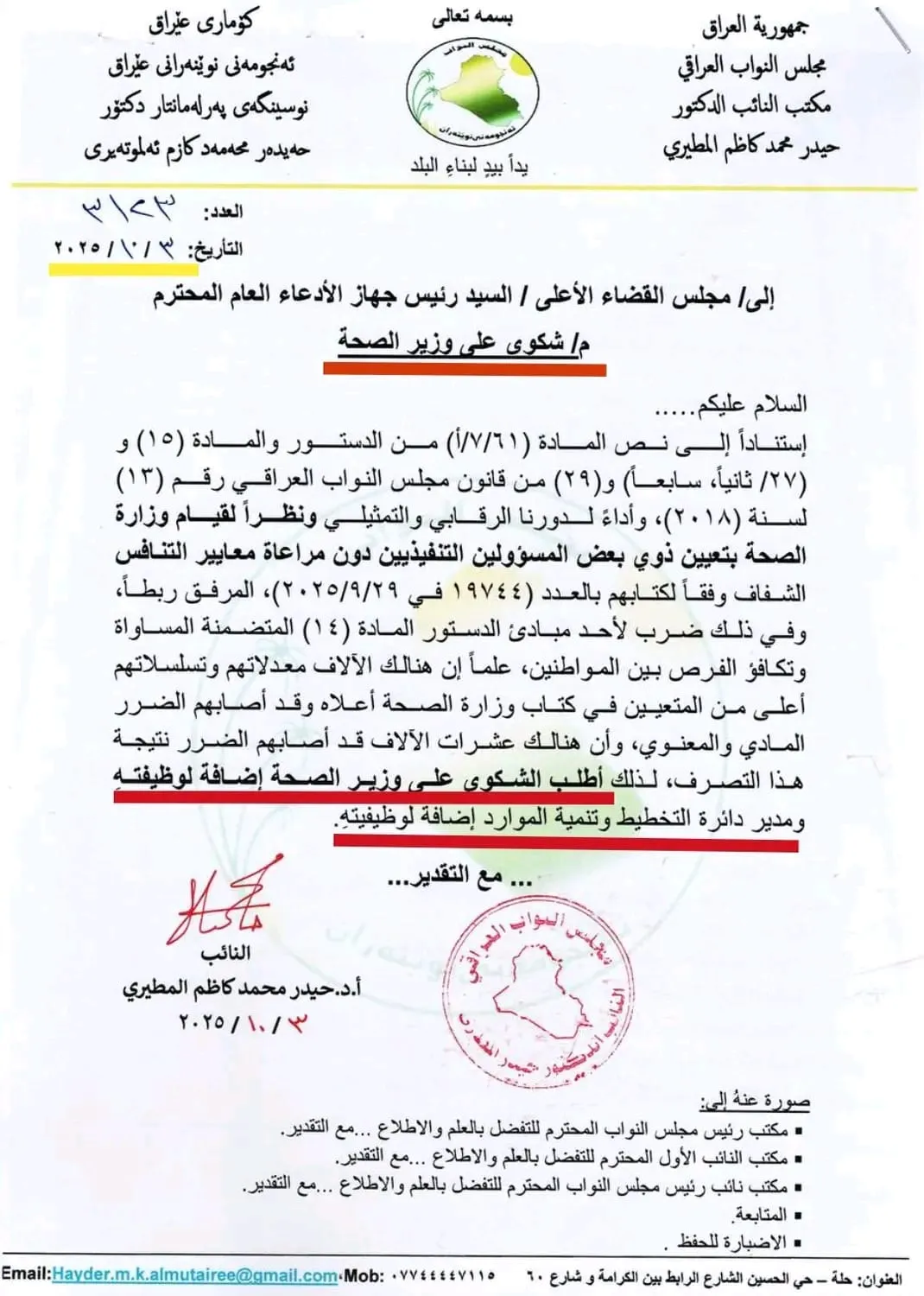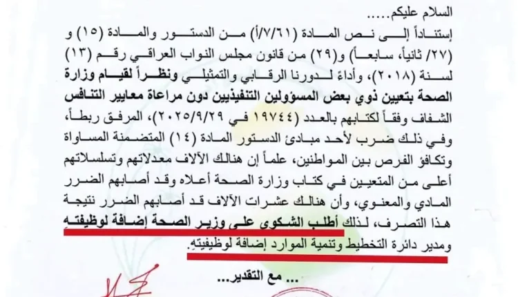 وبحسب وثيقة رسمية، فإن المطيري استند في شكواه إلى المادة (61/سابعاً/ب) من الدستور، والمادتين (15) و(27/ثانياً/سابعاً/ج) من قانون مجلس النواب رقم (13) لسنة 2018، مبيناً أن الوزارة خالفت المعايير القانونية في تعيينات صدرت وفق كتابها المرقم (19794) بتاريخ 29 أيلول/سبتمبر 2025.