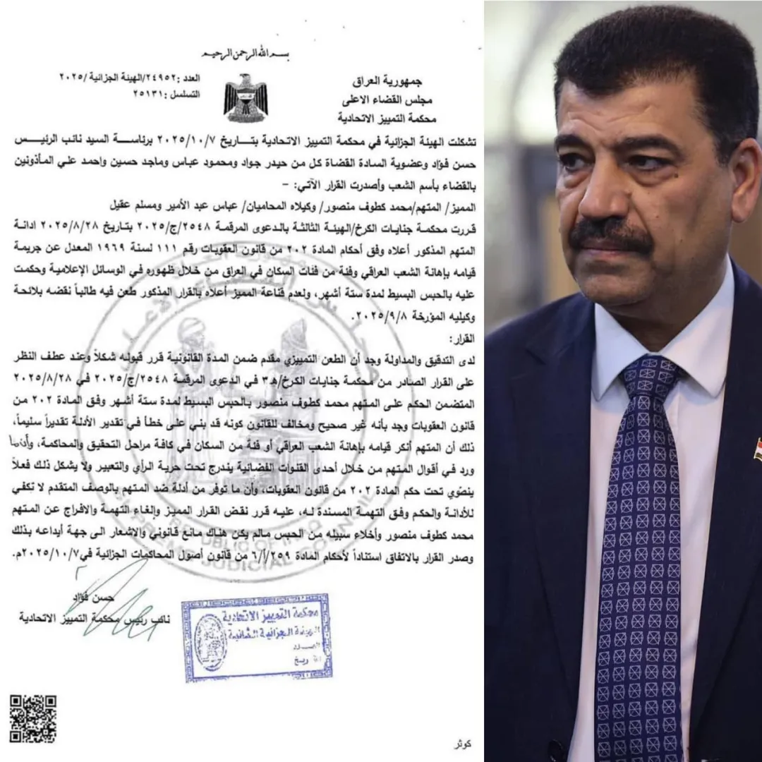 قضت محكمة التمييز الاتحادية، أمس الخميس، بنقض حكم الحبس الصادر بحق النائب السابق محمد الدايني، والذي أُدين بتهمة “إهانة الشعب العراقي”، وقررت إخلاء سبيله لعدم كفاية الأدلة.