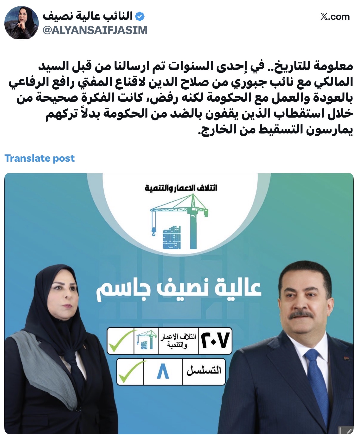 “معلومة للتاريخ.. في إحدى السنوات تم إرسالنا من قبل السيد المالكي مع نائب جبوري من صلاح الدين لإقناع المفتي رافع الرفاعي بالعودة والعمل مع الحكومة، لكنه رفض. كانت الفكرة صحيحة من خلال استقطاب الذين يقفون بالضد من الحكومة بدلاً من تركهم يمارسون التسقيط من الخارج.”