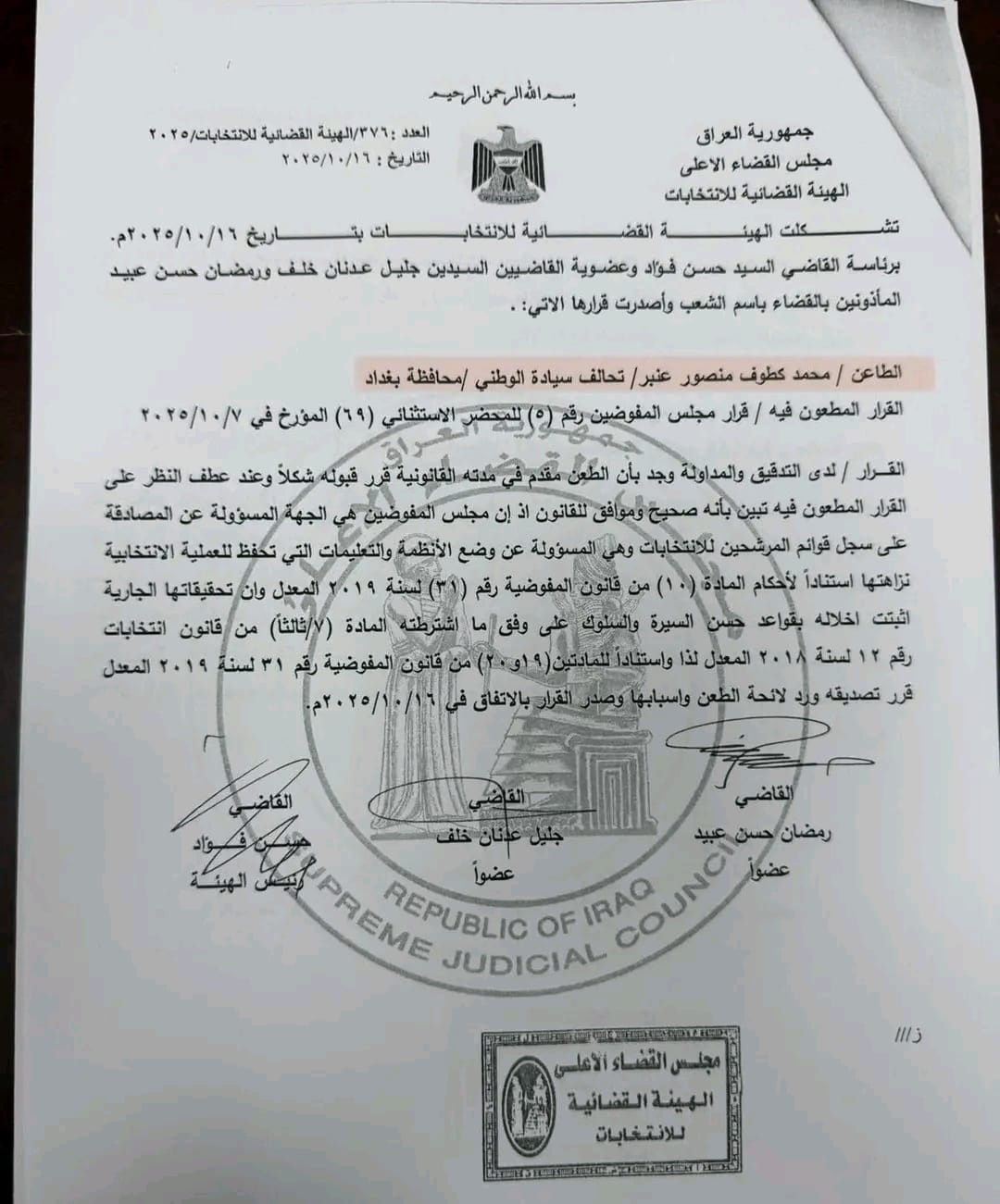 وبحسب الوثيقة الصادرة عن الهيئة القضائية للانتخابات التابعة لمجلس القضاء الأعلى، والمؤرخة في 16 تشرين الأول 2025، فقد قررت الهيئة تصديق قرار مجلس المفوضين رقم (69) الصادر بتاريخ 7 تشرين الأول الجاري، القاضي باستبعاد الدايني من الترشح.