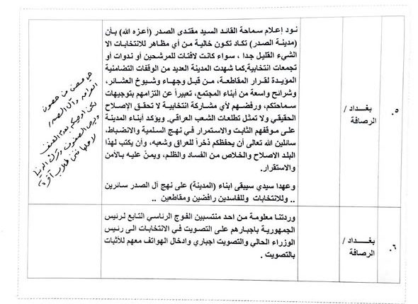 كما وجّه الصدر الشكر لعشائر البصرة التي نظمت وقفات تضامنية لدعم قرار المقاطعة، واصفاً مواقفهم بـ“الوطنية والعقائدية”. وأكد أن الكتل السياسية تخشى فعلاً من حجم المقاطعة الشعبية المرتقبة للانتخابات المقبلة.