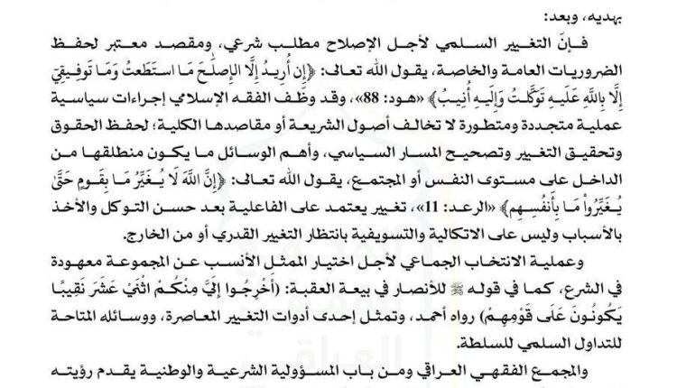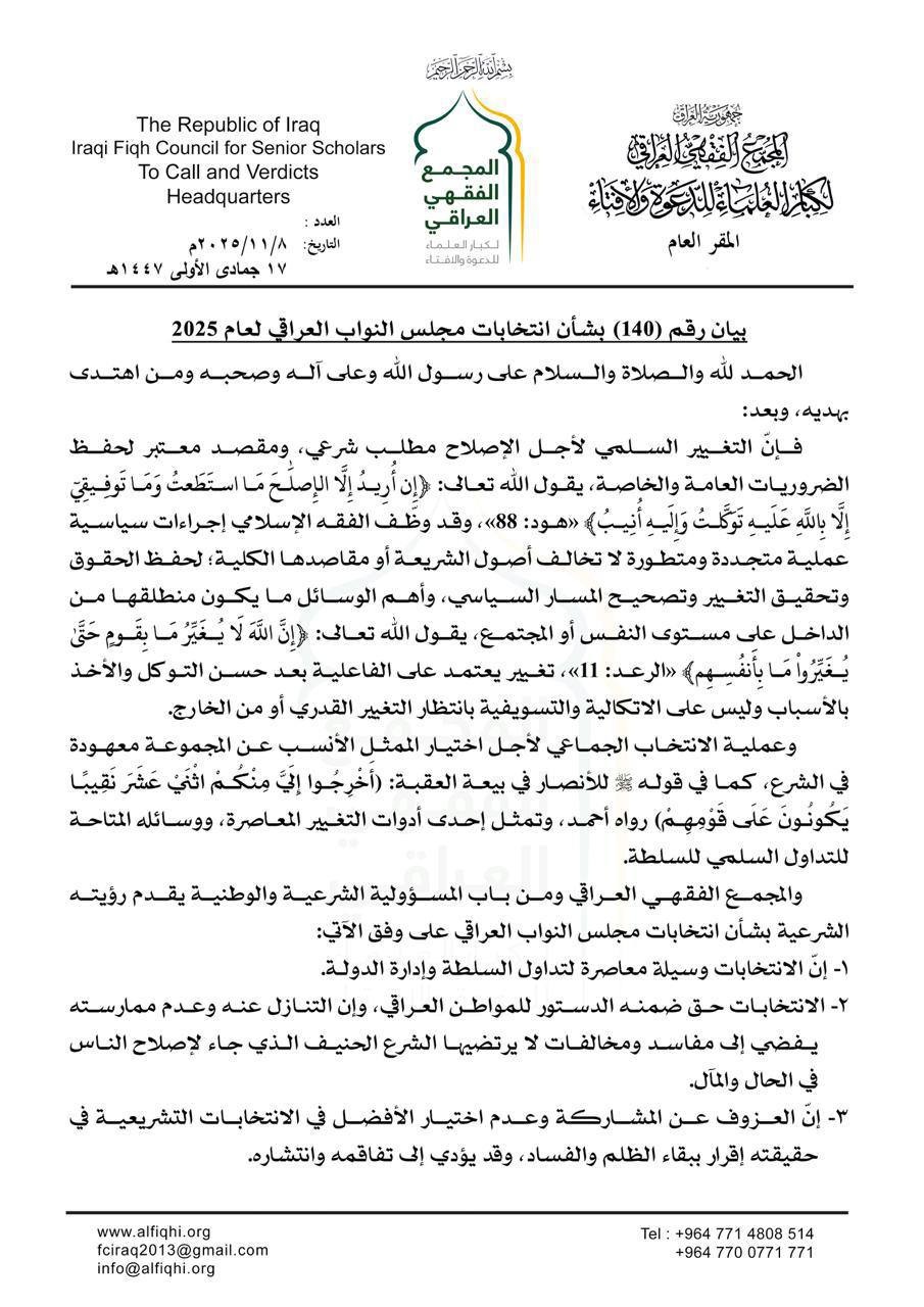 المجمع الفقهي العراقي: المشاركة في الانتخابات واجب وطني يعزز استقرار الدولة