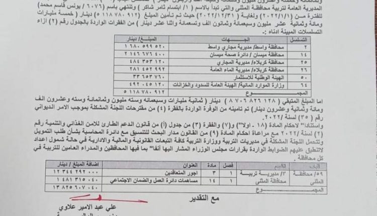وزارة المالية تطلق التخصيصات المالية للمحاضرين والإداريين لمحافظة المثنى