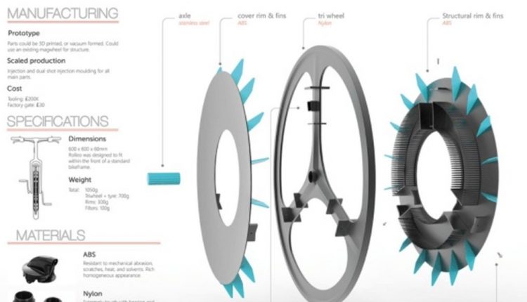 والعجلة المبتكرة في الدراجة مصممة لامتصاص الهواء الملوث من خلال تجويفها المركزي، ودفع الهواء النظيف من خلال زعانف الدراجة.